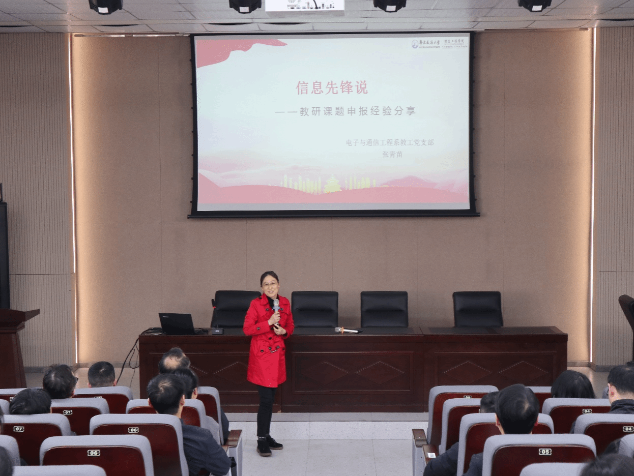 3月28日,信息学院于教5栋校友报告厅举办“信息先锋说”分享交流会。教工党支部张青苗同志以“教研课题申报”为主题做分享交流,信息工程学院全体教工党员参加会议。