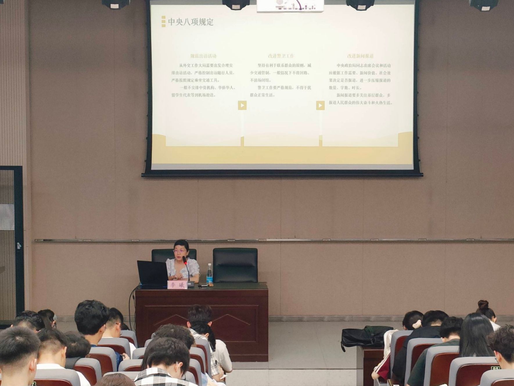 授课过程中,李曦老师系统阐释了中央八项规定与党的自我革命。她以“徙木立信”的典故为切入点,深入剖析中央八项规定的出台背景、具体条款、实施特征及显著成效。继而从理论内涵、文化根源、实践逻辑三个维度,全面介绍党的自我革命。最后以“知行合一:新时代推进党的自我革命的实践路径”为落脚点,总结强调中国共产党人需以中央八项规定精神为突破口,持续推进自我革命,落实全面从严治党,方能铸就坚定纯洁、深受人民拥护的政党。