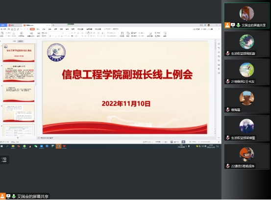 为更好地发挥副班长在平安校园建设中的作用,11月10日,信息工程学院召开副班长线上例会,会议由院学工办副主任艾国金主持,各班副班长和学生会生活权益部全体成员参会。