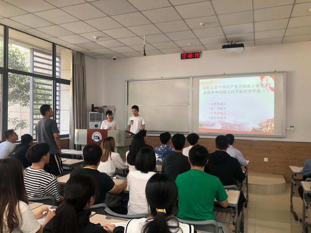 本次知识竞赛共设有单选题和多选题两种题型,采取抢答的作答形式,题目涵盖党史、新中国史、改革开放史、社会主义发展史等内容。“五四运动的直接导火线是什么?”“第一届全国人民代表大会第一次会议召开的时间是?”“什么是两岸关系的政治基础?”……主持人一念出题目,同学们便踊跃举手请求作答,现场气氛活跃热烈。场上抢答成功的同学十分自信地发言,充分展现了个人丰富的党史知识储备,展现了党员良好的精神风貌。