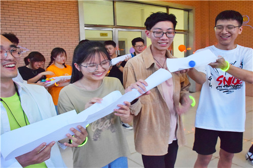 同学们分组进行“传球接龙”、“小组猜谜”、“竞猜数字”、“游戏寻宝”游戏。“小组猜谜”环节,同学们相互提示,频中谜底;“游戏寻宝”环节,同学们协作配合,连克难关。气氛逐渐活跃,同学们热切交流,现场笑声不断。