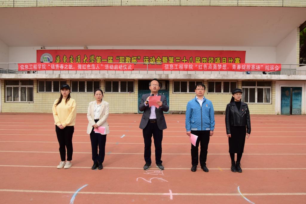 为使学生走下网络、走出寝室、走向操场,提升学院凝聚力,4月18日,信息学院于南区田径场举办“红色点亮梦想,青春绽放赛场”主题院运会。