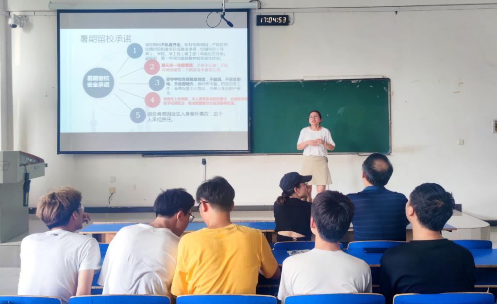杨青给同学强调《留校安全承诺书》的要求并注意以下点:1、每天九点前主动向负责人报告是否在寝室;2、离校前需向辅导员请假,再向负责人报备;3、在校期间如遇突发情况,要及时向辅导员报备;4、暑期餐饮注意事项;5、提前备好用电。她提醒同学们,在校期间仍要注意谨防电信诈骗。