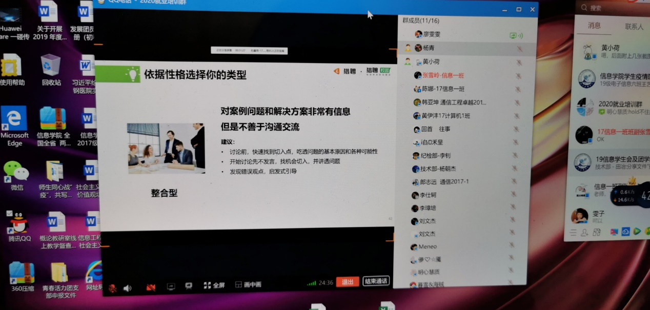 在全球疫情严峻,经济受到冲击的背景下,疫情期间的就业局势不容乐观。为促进学生优质就业,4月1日至4日,信息学院通过QQ视频形式开展线上就业指导培训班,邀请现任猎聘校园华东区高级项目经理、金牌简历顾问—廖雯雯老师担任主讲老师,200多名学生线上参与了本次培训。