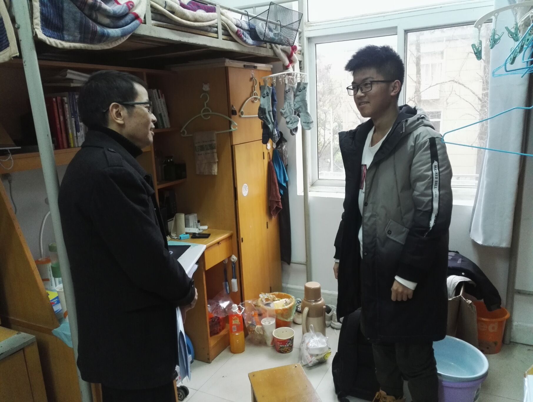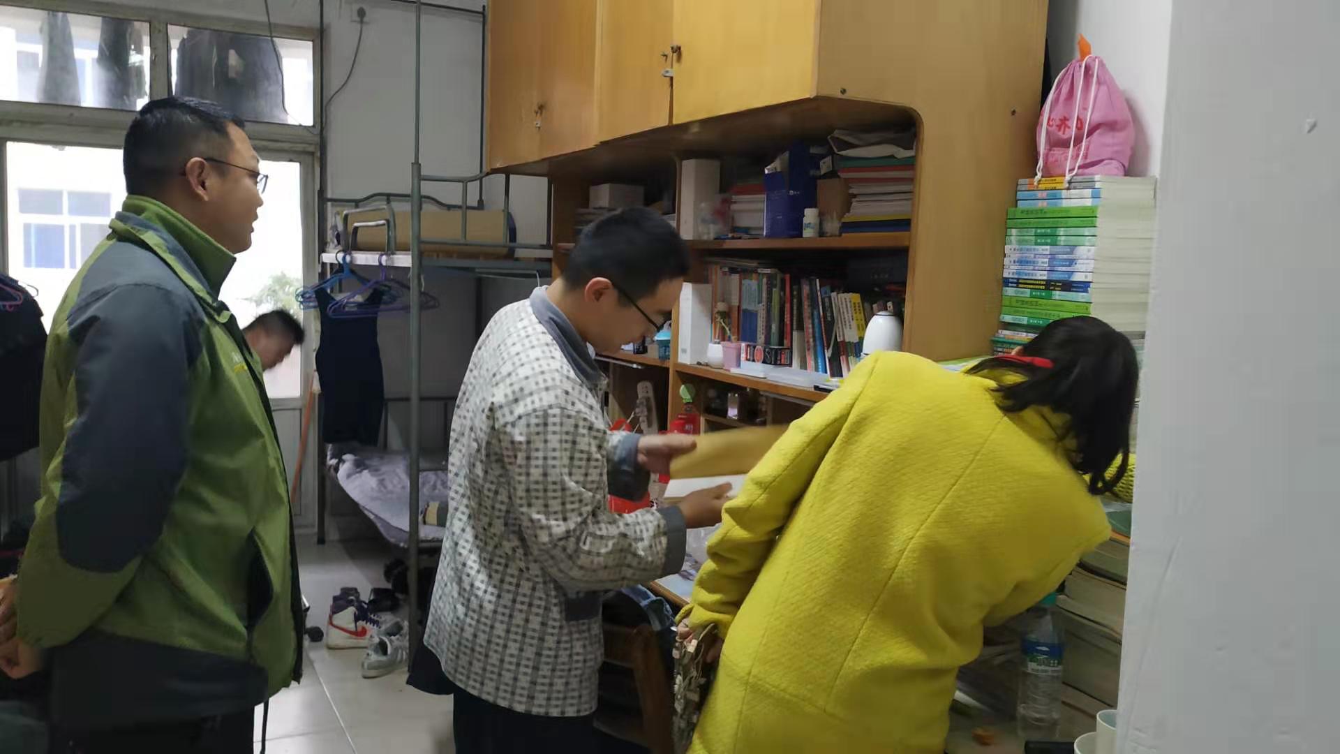“你们寝室共有几个人留校,都打算什么时候回家?”全体老师前往宿舍看望留校学生,仔细询问同学们离校时间,并叮嘱他们离校注意安全。老师们提醒他们在离校前,门窗应锁好,水电开关关闭。