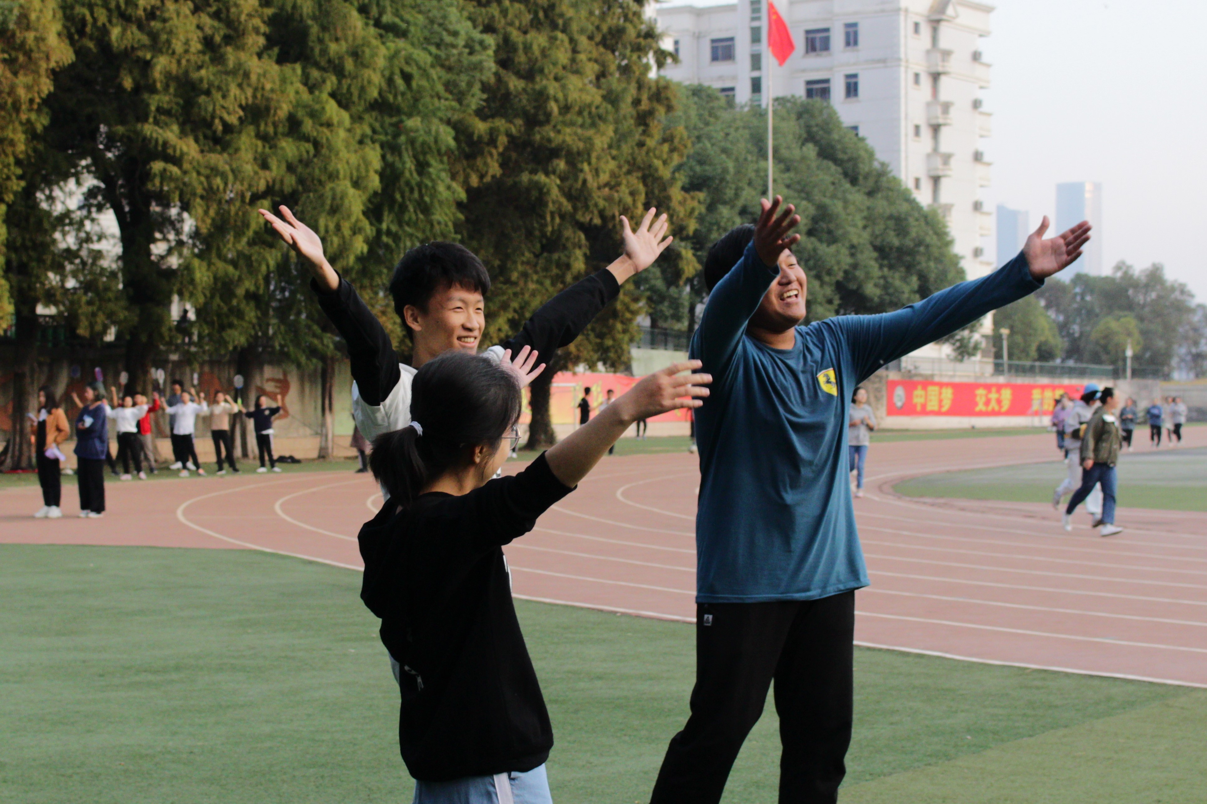 活动开始,两班同学打乱围成一个圈进行“抱团”游戏,通过此游戏将两班同学打乱分成四组,每组11人,规定每组至少有1个女生,同班同学不得超过8人。热身活动后,各组人员也最终确定,开始正式的游戏环节。