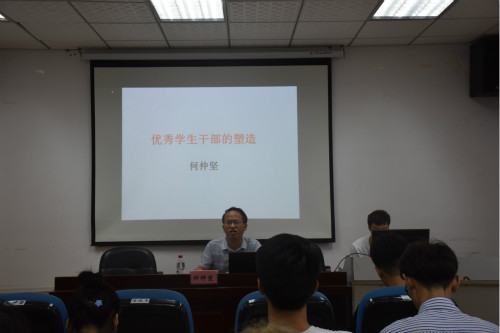何仲坚主讲《优秀学生干部的塑造》一题。他首先讲解了学生干部的职责、角色、使命。他对优秀学生干部的要求是具备正确的价值观、开放思维、创新精神和综合素质。他从五个方面讲解“优秀学生干部应该怎样塑造”,一是做到四点认识:认识所处时代、认识所在学校、认识所在学院、认识自己特点;二是培养四种素质:听、说、读、写;三是深化四种意识:学习意识、责任意识、团队意识和创新意识;四是提高能力的途径:勤于思考、乐于行动、善于总结;五是开展工作把握五个关键:把握时代命脉、寻找合适载体、制定科学计划、提高执行力度、注重细枝末节。他认为当代青年大学生有个性但团队意识不足、有冲劲但抗压能力不足、有想法但行动力不足,并对这样的大学生提出建议:大学时候应该取长补短,工作时候应当扬长避短。