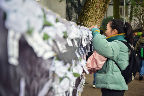 “正义虽然会迟到,但绝不会缺席”“历史不会因时代变迁而改变,事实也不会因巧舌抵赖而消失”“唯愿你来世繁花似锦”,几百小白花上的纸条是同学们对日军暴行的指控,对死难者的祝愿,也是对和平盛世的希冀。