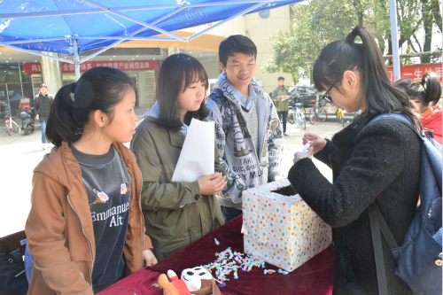 “以下有关节约用水的方式,哪些是错误的?”、“水资源可持续利用应该遵循哪些原则?”、“我国水资源的特点是?”……本次活动以有奖竞答的形式举行,参与者抽取纸箱中的题目作答。参与竞答的同学们抓耳挠腮,冥思苦想,有的参与者两两互相讨论做题,活动现场人头攒动,一派热闹非凡。