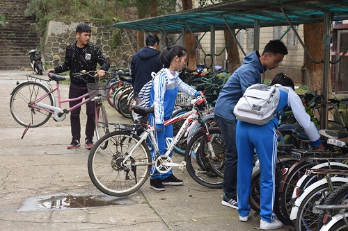信息学子在摆放自行车