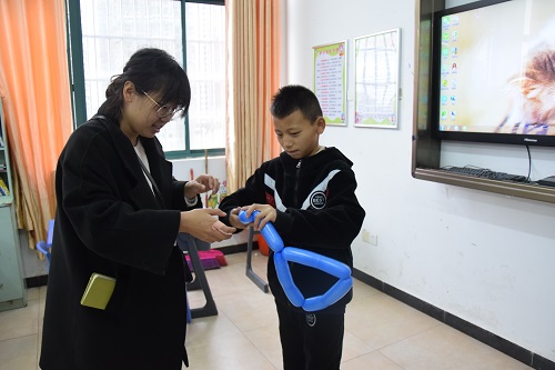 志愿者教孩子们绑气球