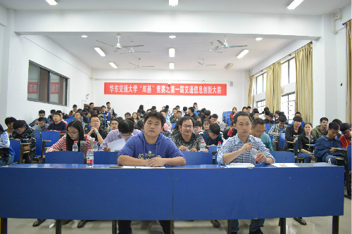 "双基"竞赛之第一届交通信息创新大赛。本次比赛由信息工程系承办,共有十支队伍参赛。评委团由信息学院学工办主任兼团委书记陈文锦,王杉、王登辉、刘志伟、王鹏鸣四位老师以及学生代表张展杨组成。