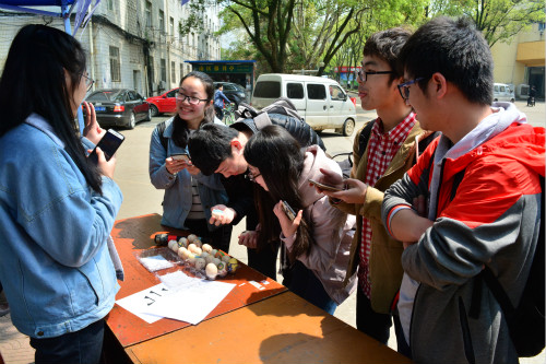 “猜清明习俗,送手绘鸡蛋啦!”新闻宣传部干事拿着话筒对过往学生喊道。摊位旁边的展板上写着各种各样的传统节日习俗,其中隐藏着7个清明节习俗,每位同学需要一次性说出5个习俗,只要有4个是清明节习俗,就可以到工作人员处领取可爱的手绘鸡蛋。