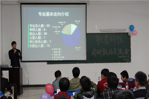 减少和避免低年级同学在考研和就业方面的盲目性,激发同学们的学习与考研热情,4月24日,由学生会学术部承办的“职来研往”考研就业交流会于教14栋212室召开资深考研分析师廖保老师、12级信息2班孟帅、12级计算机1班孙兴作为主讲嘉宾应邀出席本次交流会