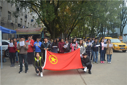“选择了你便选择了义无反顾,选择了你便选择了无休无止,选择了一份英雄的事业,选择了一块人生的绿地……”信息学子在主持人王前进的带领下慷慨激昂地朗诵诗词,感情饱满,振奋人心,字里行间都流露着对党团的浓浓情意全面诠释了作为共产主义接班人的责任和义务,吸引不少同学驻足观看。同时本次活动还设置了抽奖活动,幸运者均可与团旗合影留念,并获得由主办方提供的彩印照片一张。现场寒风凛冽,仍旧不减同学们的热情,工作人员积极为大家解答疑惑,并介绍照片征集的范围和要求,场面十分热闹。