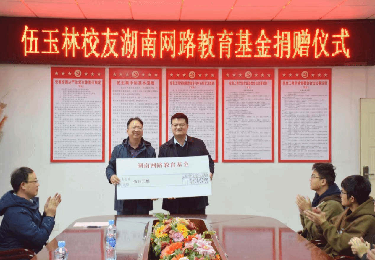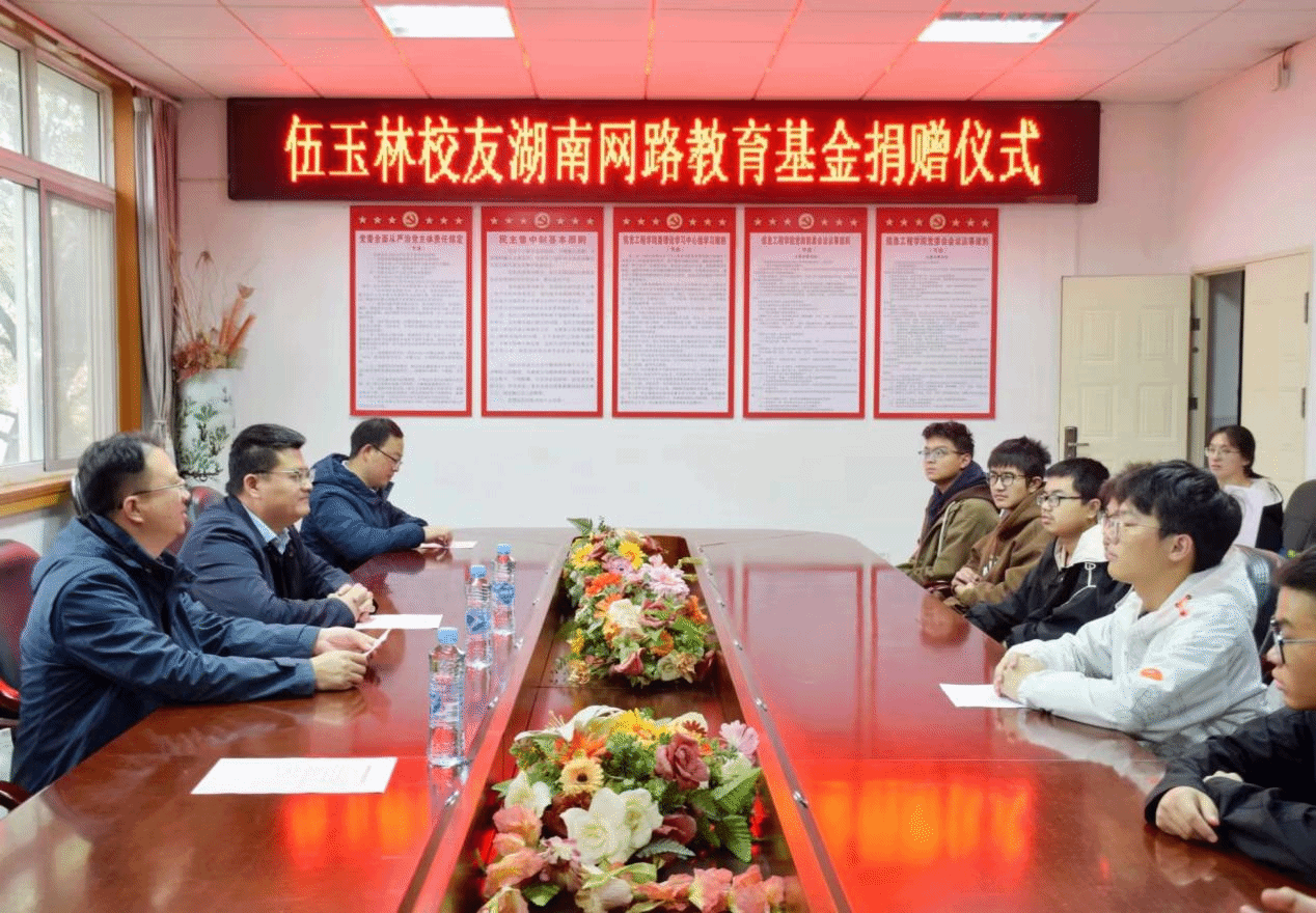 11月25日,信息学院于教四栋311室举行伍玉林校友湖南网路教育基金捐赠仪式,学院优秀校友伍玉林、副院长姜楠、学工办主任兼团委书记艾国金出席仪式。
