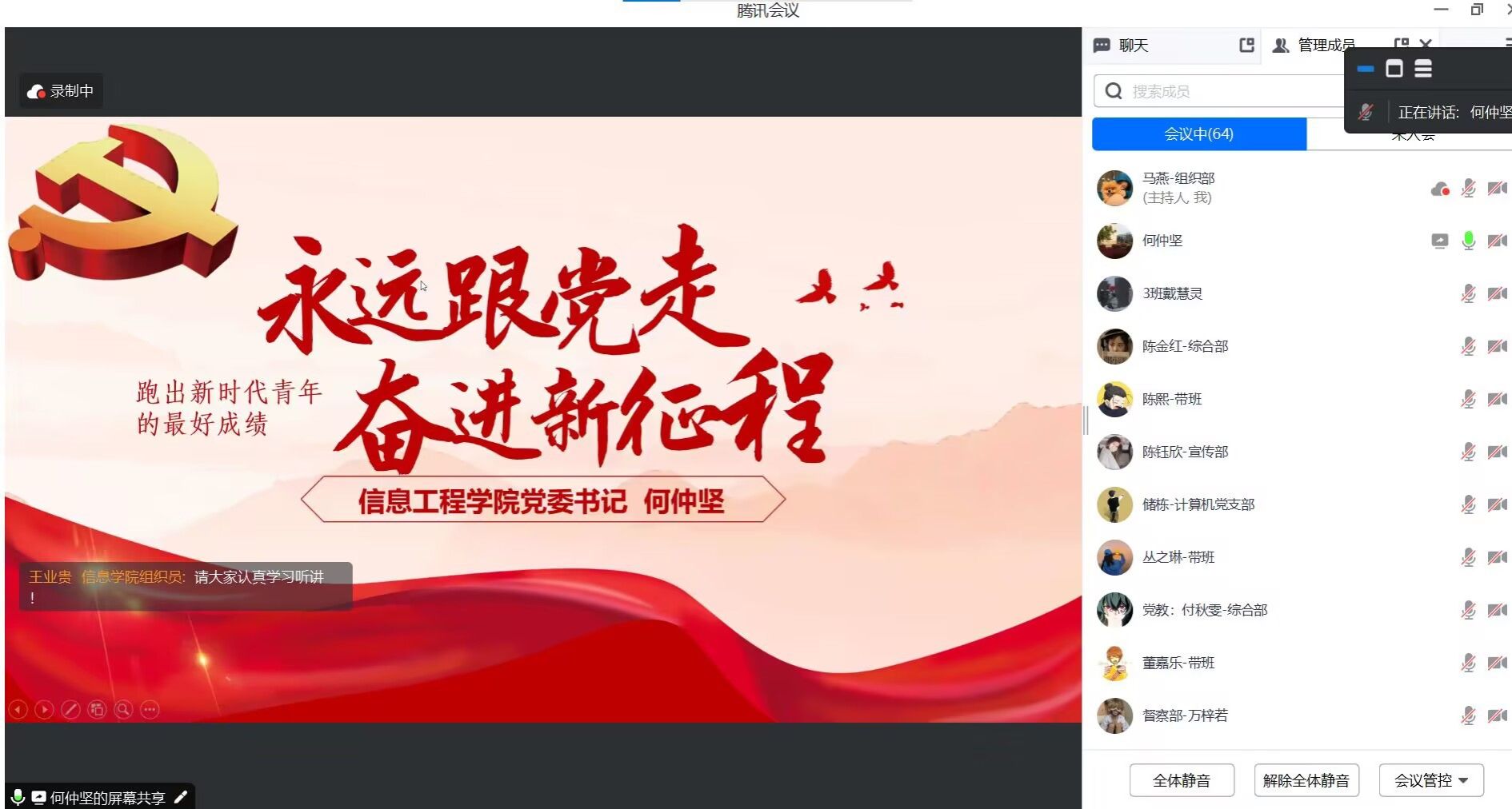 为了使学院党支部工作标准化、规范化,确保各项工作高质量开展,深入学习贯彻习近平新时代中国特色社会主义思想,推动青年学生党员坚定理想信念,担当历史使命,7月27日,信息学院于线上开展党支部工作业务培训会,本次会议由院党委书记何仲坚主讲,党教中心全体成员、2023级带班党员、各支部支委参会。