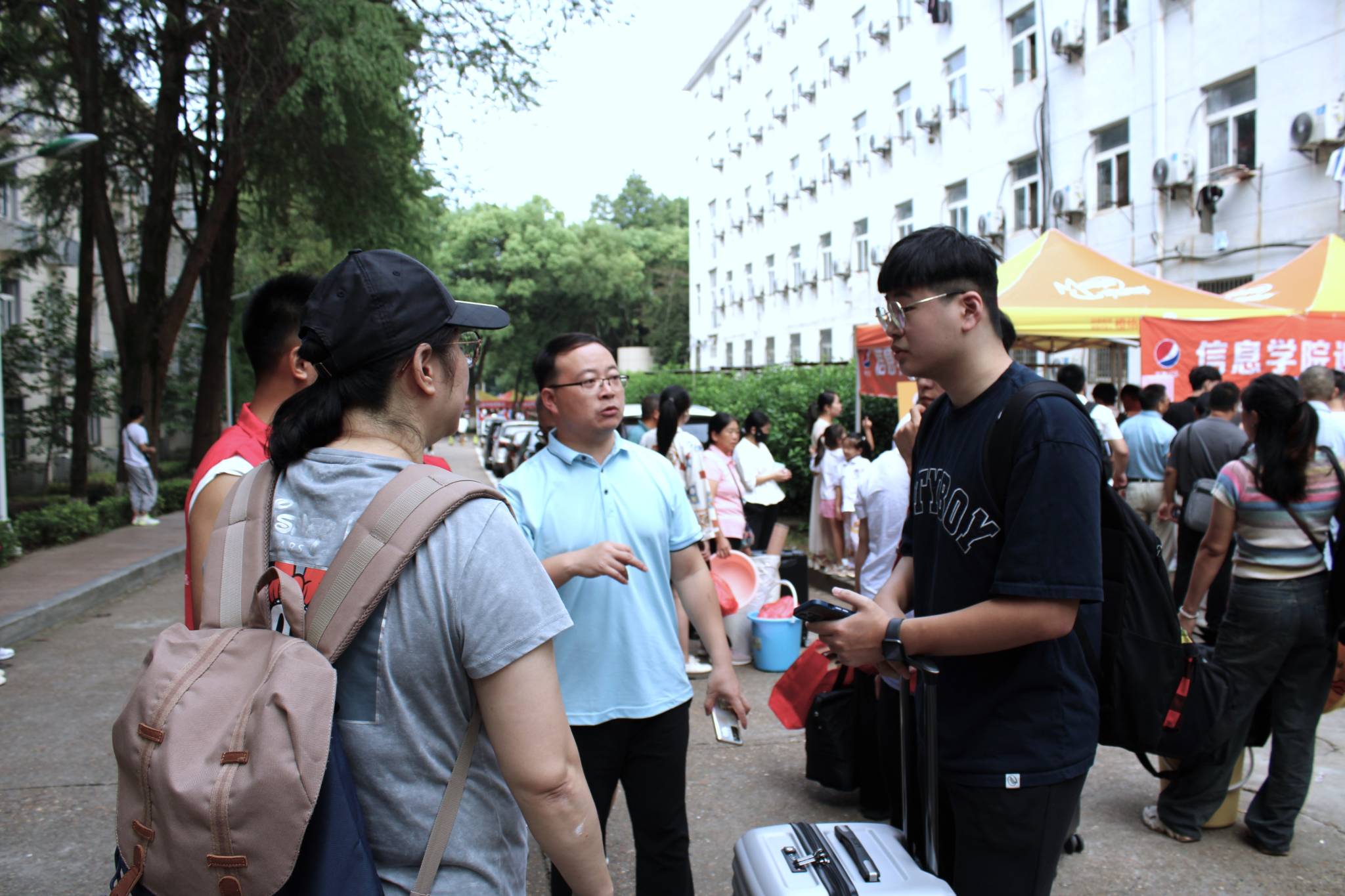 信息工程学院党委书记何仲坚、学工办主任艾国金心系新生,一齐来到新生报到地点了解具体情况并前往宿舍看望新生,与新生及其家长亲切交谈,殷切的嘱托令远来求学的新生们减少了紧张与不安,切身的关怀使新生们更快的融入大学生活。