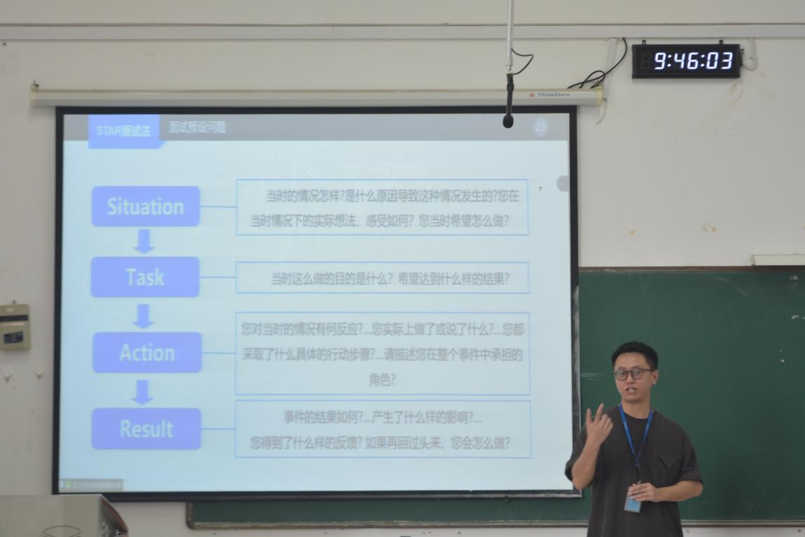 李楚海首先向同学们分析当下就业难的现状。他希望同学们能从本次交流会中收获知识,并将学到的内容应用于实践中,提高求职能力。李楚海从简历制作和应对面试两个方面展开讲解,他指出一份好的简历需要简洁明了,要清晰简明地描述做过的项目、自身担任的角色以及项目的实现过程。此外,李楚海还展示了几份优秀的简历,向同学们展示其中的亮点让他们受益匪浅。针对面试准备,李楚海介绍了“STAR面试法”,并从四个方面——“Situation”、“Task”、“Action”、“Result”——向同学们仔细讲解如何准备面试。此次交流会帮助同学们提高了职业素养和求职能力,从而能够让同学们更好地应对未来的职场挑战。