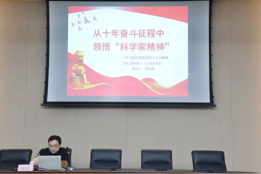 为全面深入学习宣传贯彻党的二十大精神,12月9日,信息工程学院于教5栋学术报告厅进行党的二十大精神宣讲,校博士宣讲团成员易钰程面向学院全体学生开讲。