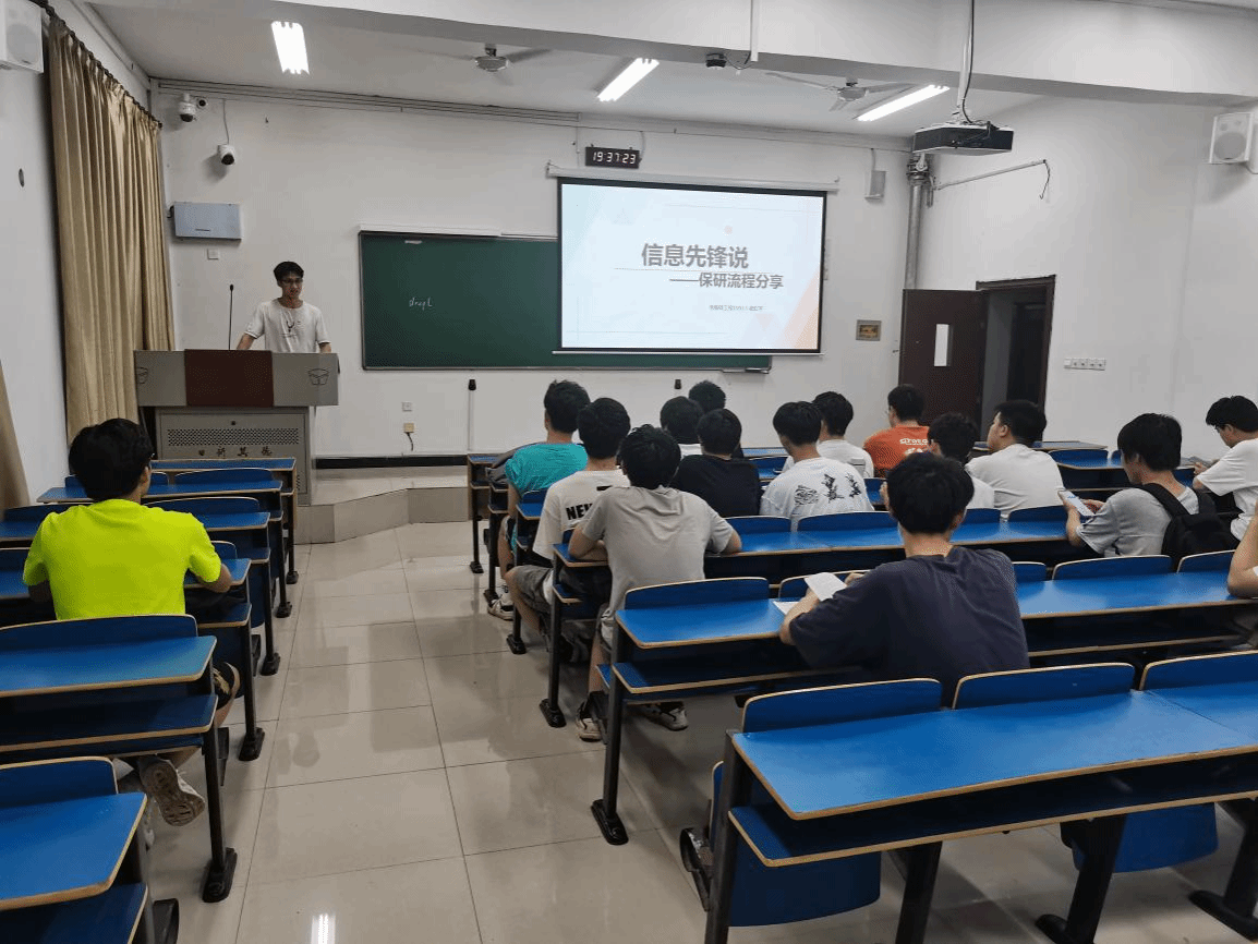5月23日,信息工程学院举办“信息先锋说”第三十七期分享会,此次会议由创新基地学生党支部组织承办。支部成员诸虹宇成功推免至南京航空航天大学,由他以保研经验为主题作分享交流。计算机2023-1班、计算机2023-2班全体同学参加会议。