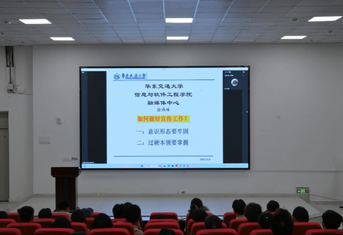 融媒体中心副主任徐玮峰从意识形态与业务能力两个维度,系统讲解了宣传工作的核心要义与实践方法。他深入阐释了宣传工作的本质、基本要求和根本方法,强调宣传的核心在于充分展现学院风采。此外,他还就摄影构图、色彩搭配、曝光控制、修图技巧及相机使用等方面进行了专业指导,有效提升了“小青团”的宣传意识与技术能力。