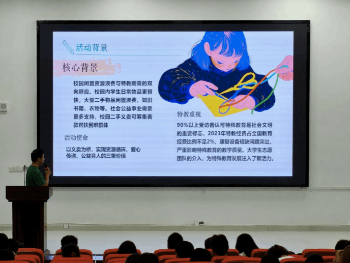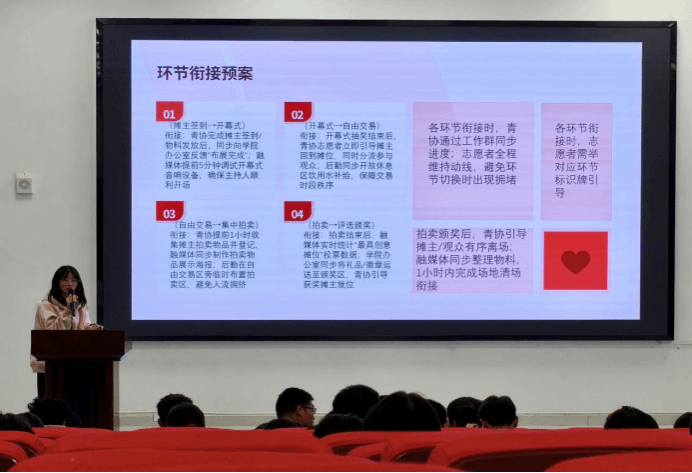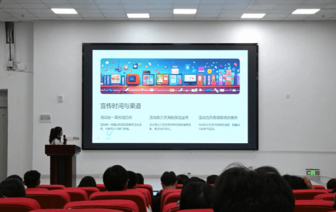 学生会主席团成员刘徽翔围绕活动策划的框架与撰写要点展开讲解。他指出,策划应从“人、事、物”三个维度入手,并结合旧书回收、草地音乐节等学院品牌志愿项目,系统拆解了“活动背景—流程设计—风险预案—活动预算—注意事项”的项目化逻辑。同时,他还现场演示了PPT制作的基本技巧,切实增强了“小青团”的策划与展示能力。
