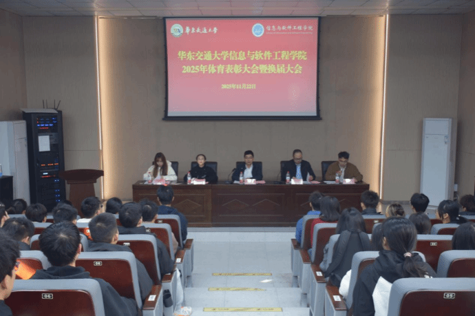 2025年体育工作表彰大会暨换届大会在校友报告厅举行。院党委书记魏永峰、党委副书记冯荣刚,院团委书记李萌萌、体育中心指导老师胡林娜出席大会,院团委副书记肖志鹏主持会议。
